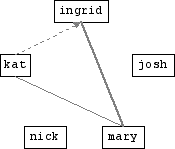 We'll further assume all these people are blogging, and have blogrolls that list all the other members of the group. In the first example, Ingrid would have the following links: <a href="http://josh.example.com/" rel="friend met">Josh</a> <a href="http://kat.example.com/" rel="met acquaintance">Kat</a> <a href="http://mary.example.com/" rel="co-worker friend met">Mary</a> <a href="http://nick.example.com/">Nick</a>